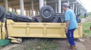 “Ya jadi untuk info awal diduga pecah ban sehingga mobil oleng dan keluar tol jatuh ke tanah, sedangkan untuk kerusakan sendiri dari tol sendiri tidak ada, berarti mobil ini melompat,” tuturnya.