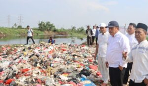 BABELAN - Pj Bupati Bekasi Dedy Supriyadi meninjau tumpukan sampah sepanjang 200 meter di TPS ilegal yang ada di bantaran Kali...