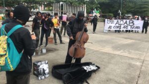 “Ini adalah salah satu kritik ya, beberapa hari lalu banyak pembungkaman mulai dari lukisan, teater payung hitam di Bandung dicekal, nah terkahir ini sekarang Band Sukatani,” kata Alfiansyah koordinator aksi.